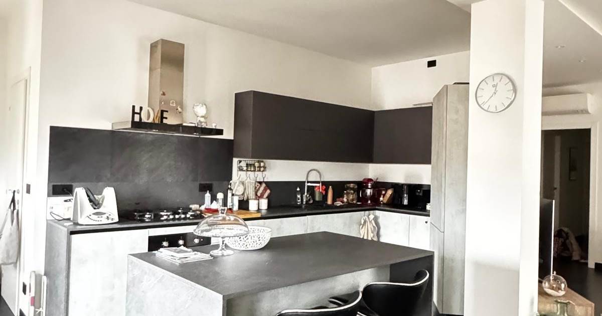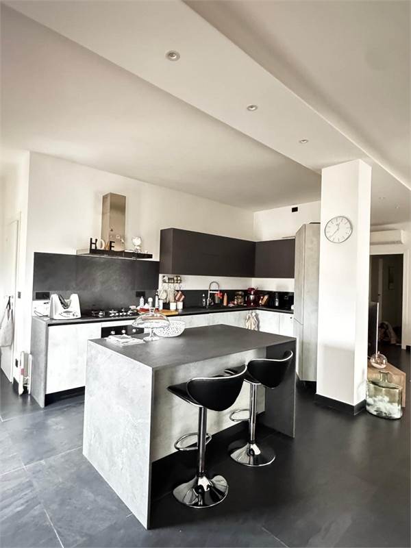 Spaziosa e luminosa zona giorno con doppia grande cucina, dotata di isola cucina e accesso ai terrazzi